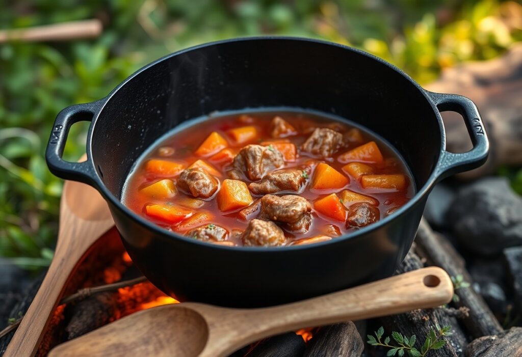 Right equipment plays a significant role in the success of your campfire cooking experience. Opt for sturdy, heat-resistant tools such as a cast-iron Dutch oven, grilling grate, and long-handled utensils. Cast iron is particularly suited for outdoor cooking as it provides even heat distribution and can withstand high temperatures, making it perfect for your hearty venison stew.