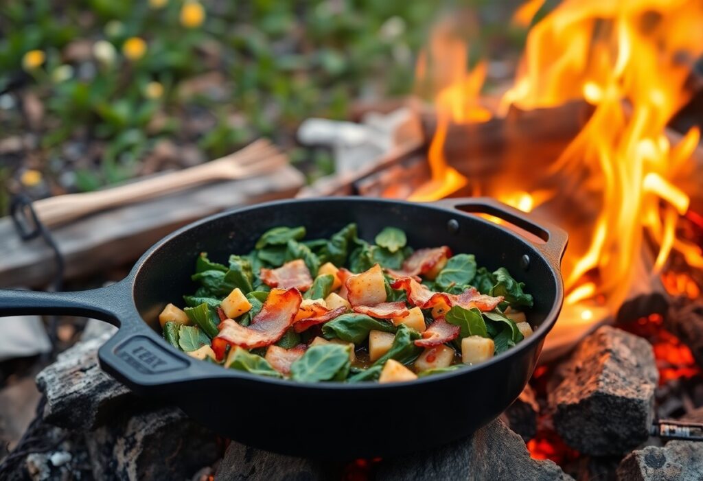 When considering campfire cooking, she knows that side dishes can elevate any outdoor meal. One such hearty option is the smoky skillet collard greens prepared with bacon. This dish is perfect for adding a vibrant touch to spring evenings spent around the fire. Ideal for those looking to enhance their camp menu, these greens are both flavorful and easy to prepare with minimal equipment.